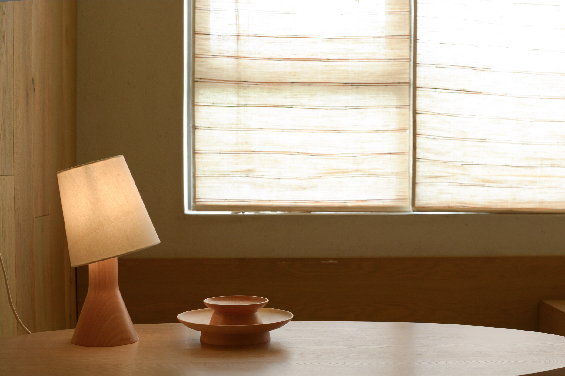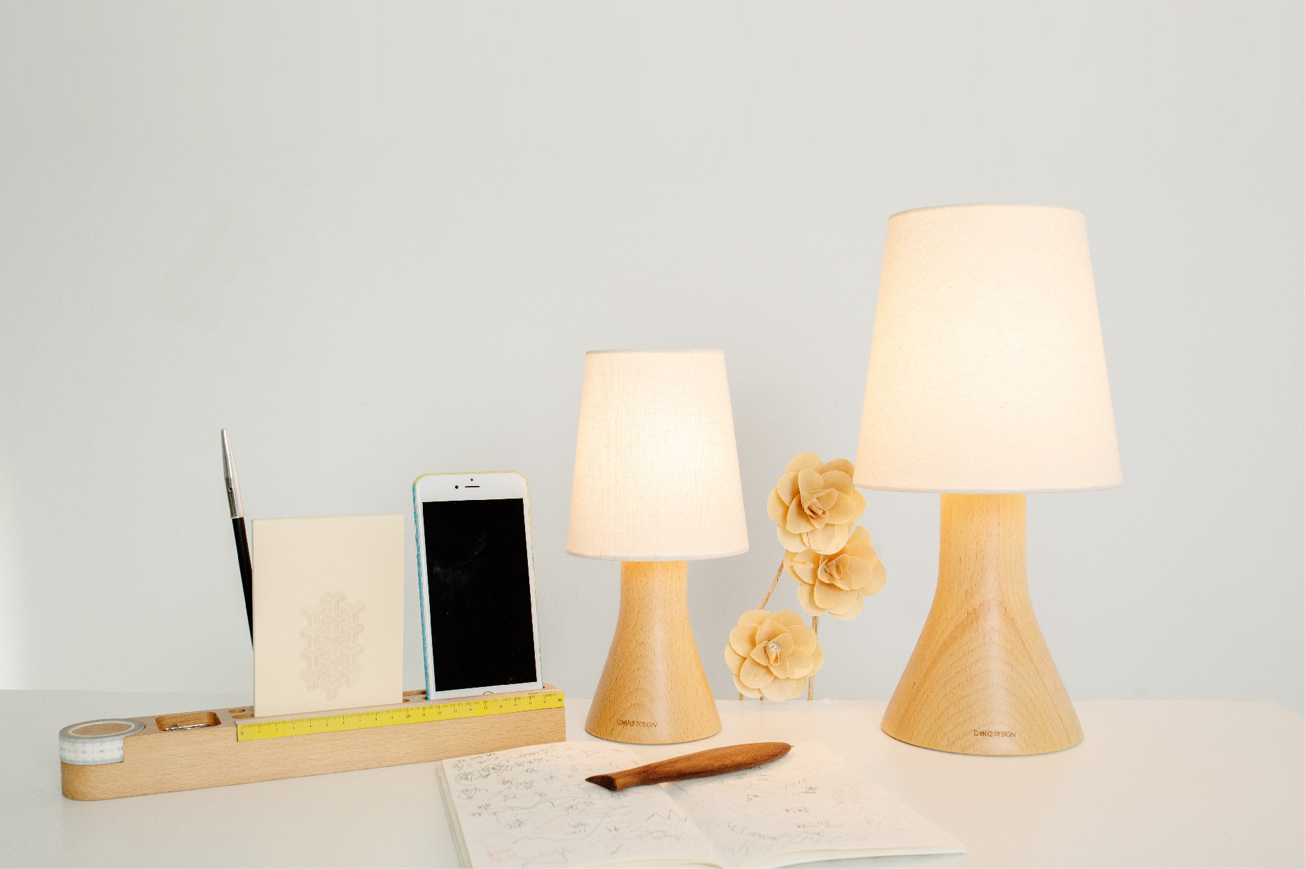 这款台灯的灯体设计来源于烧杯,灯体的斜面可以让灯光均匀反射。整个台灯的设计紧凑小巧而可爱。底座为进口德国榉木,灯罩为麻布。